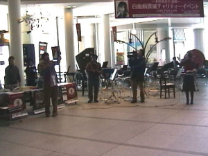 写真:当日11:30頃。設営作業中の風景。コンサート会場側から山形駅の方を見ています。奥のプロジェクターで美奈子さんが歌っていますね。「ジュピター」「白鳥」「マリリン」などをループで流していました。
