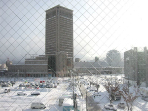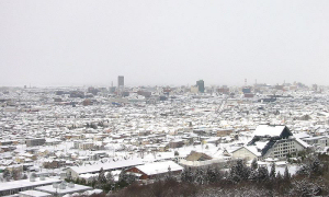 写真:翌朝、泊まっていたホテルから、イベントの行われた霞城セントラルを眺めている図です。イベント終了後から雪が降り続いていましたが、朝には美奈太陽も出て来てくれました。気温が低く、いつもにまして白い雪景色が輝いていました。