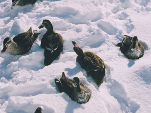 写真:「霞城(山形城)」の名の通り、イベント会場の少し北に最上義光公の城址があるのですが、そこのお堀ばたで遊んでいたカモたちです。人に慣れていて、雪に埋もれながら寄ってきてくれる、かわいいヤツらです。